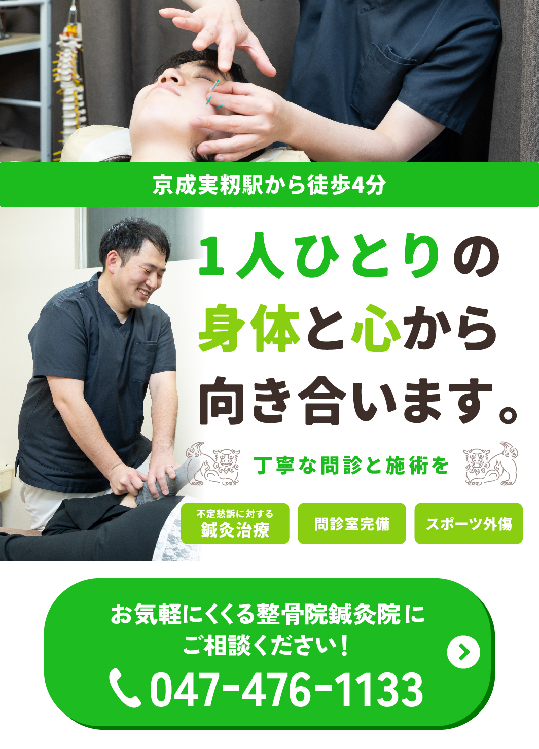 当院は平成23年からここ習志野市実籾の地域で整骨院・鍼灸院を開業しました。【くくる】とは沖縄の方言『心』を意味し、患者様一人ひとりの身体と『心』から向き合い、治すお手伝いがしたいと願い『くくる整骨院・鍼灸院』という院名を付けました。急性のお怪我から慢性の痛みまで幅広く対応し、皆様の不調を治すお手伝いができるよう日々尽力しております。お怪我や交通事故、肩こり、腰痛、不定愁訴の痛みなど身体の事はご相談ください。